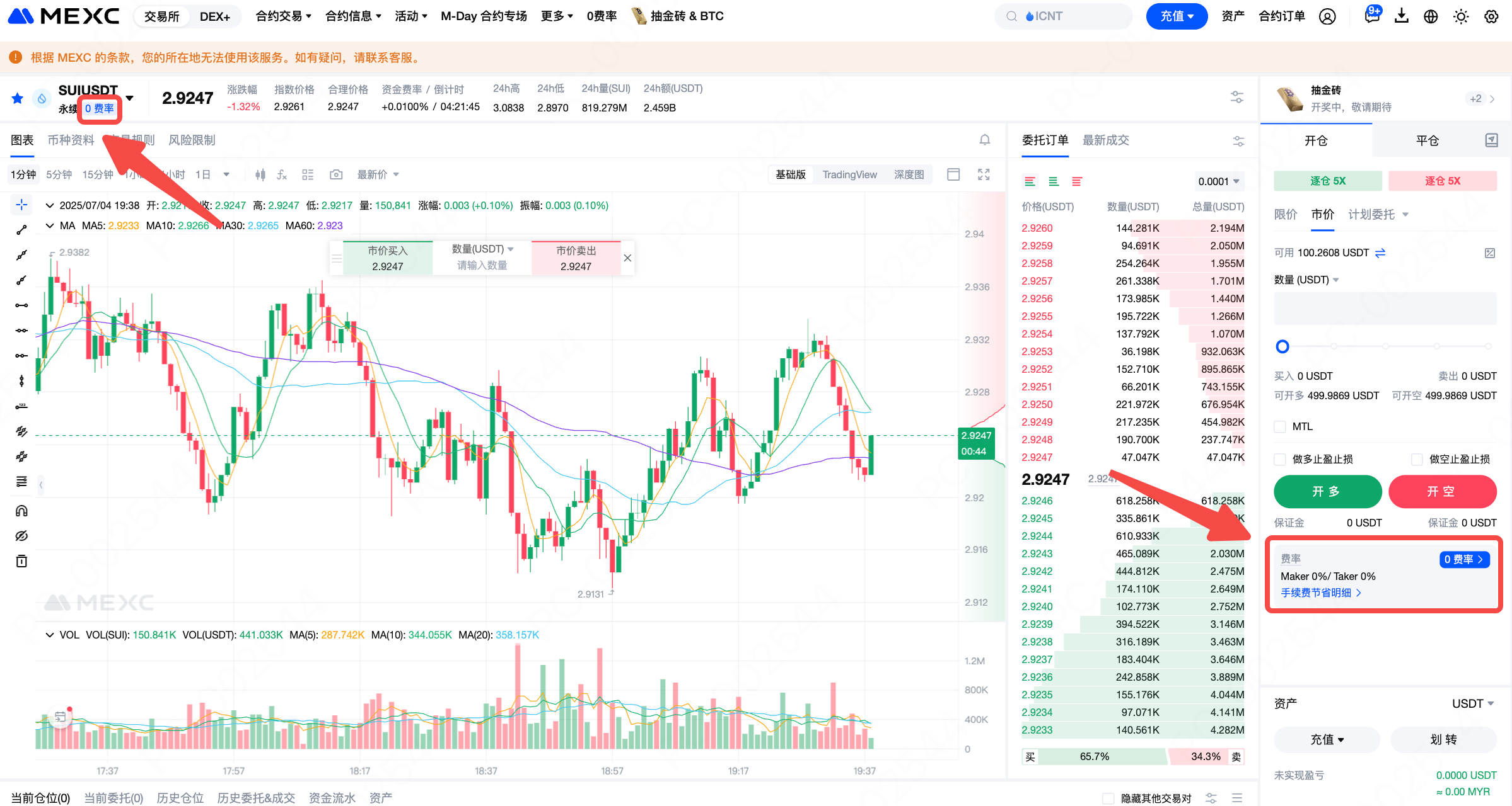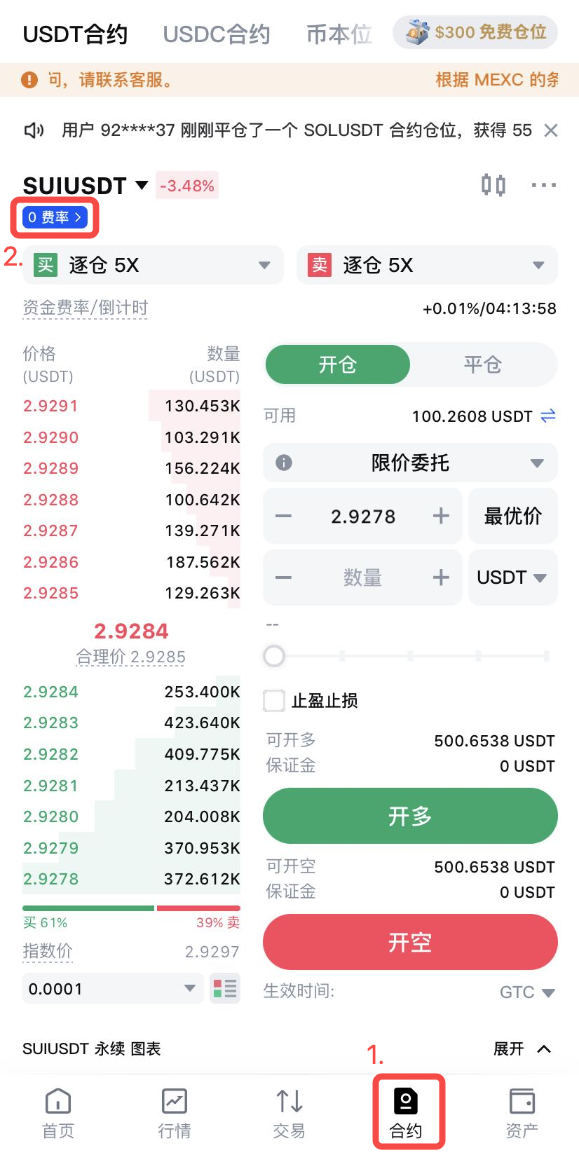 进入合约交易页,查看币对下是否显示“0 费率”标签或在右下角查看具体费率