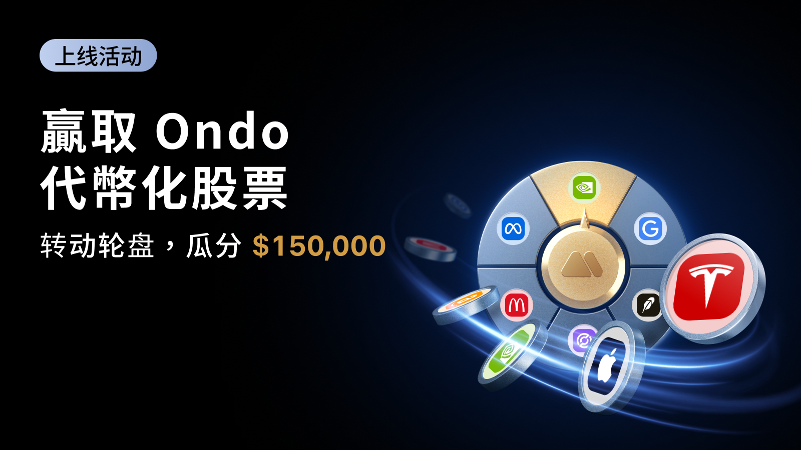 为庆祝本次上线,我们特别推出 Ondo GlobalMarkets 幸运转盘活动。完成简单任务,转动轮盘,瓜分 $150,000 代币化股票!