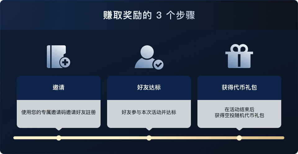 活动期间,好友通过您的活动推荐码成功注册并完成上述任意任务,即可为您赢取价值 10 USDT 的随机代币礼包。
