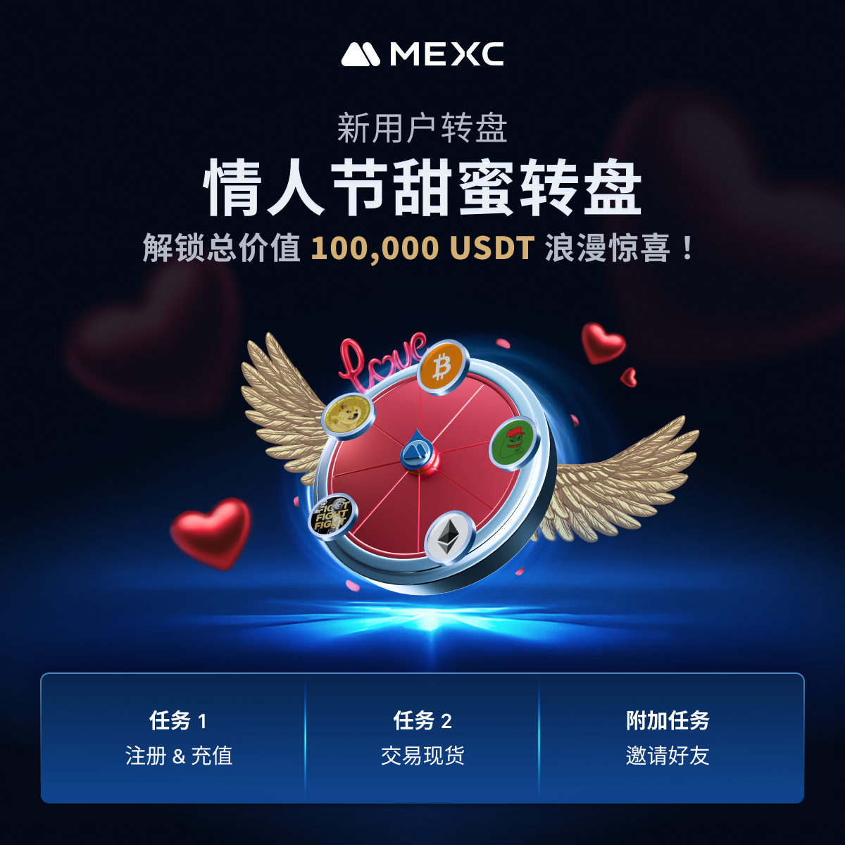 爱意满满,尽在 MEXC!今年情人节,转动转盘,赢取总价值 100,000 USDT 的代币礼包,浪漫与奖励等您来拿!💕
