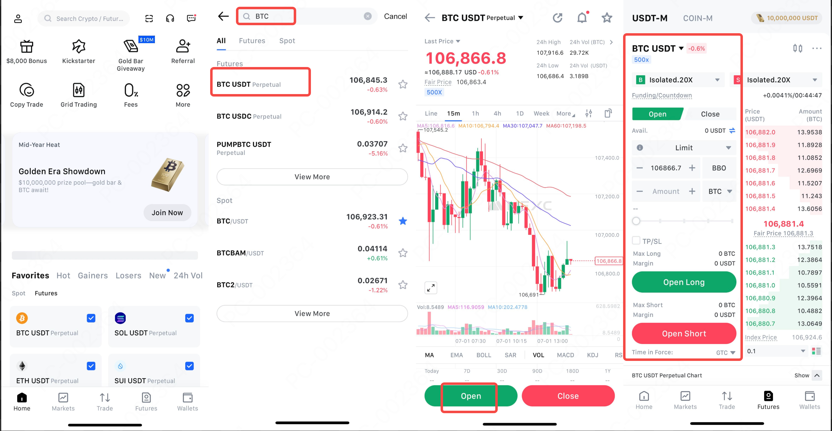 看涨趋势行情 | 开多仓(做多)+ 长线持有 | 配置逐仓杠杆,设置合理止盈止损,结合MACD与支撑位判断入场;长期持有时关注资金费率 |