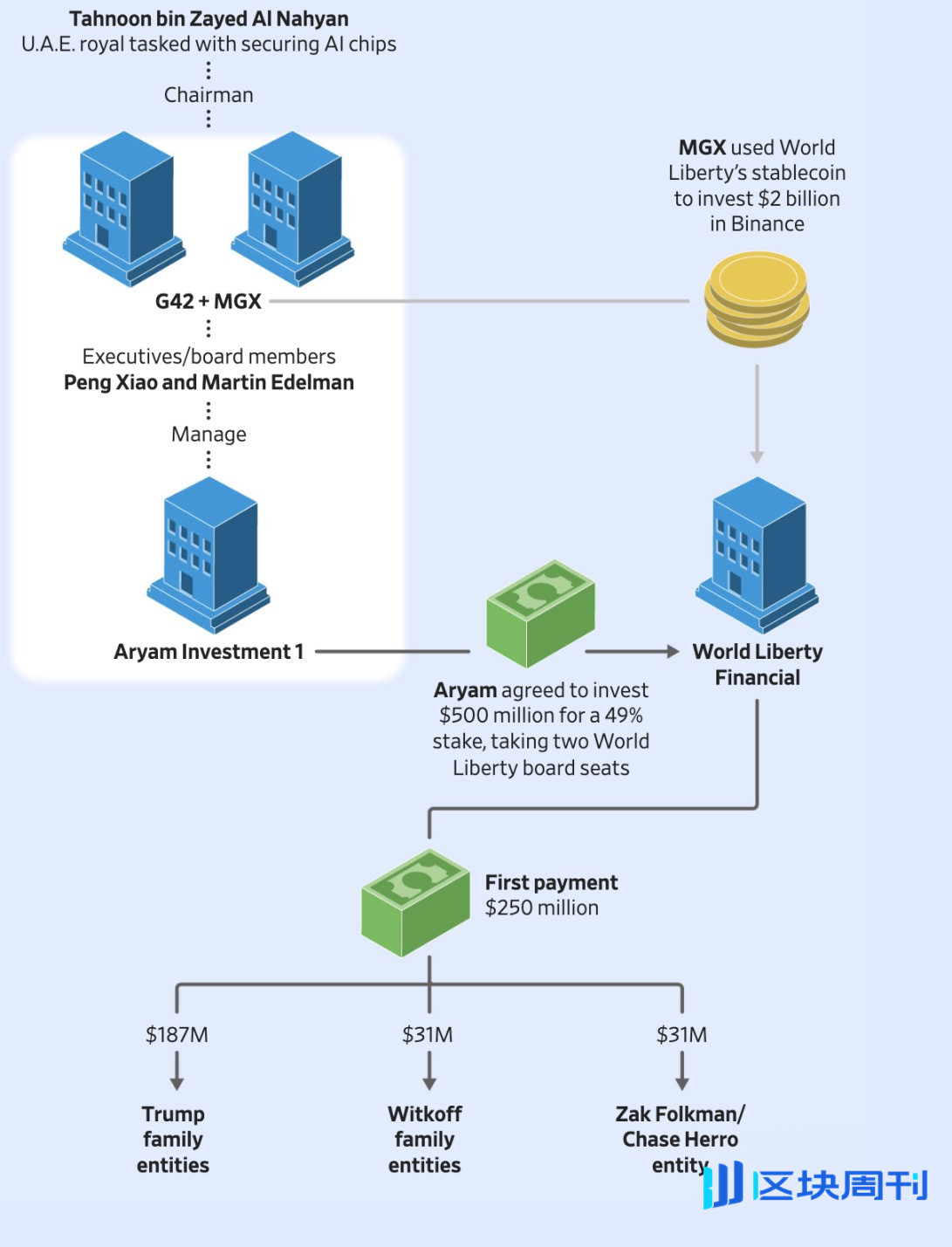 美阿芯片协议于去年 5 月公布前数周,World Liberty Financial 首席执行官 Zach Witkoff 宣布,Tahnoon 牵头的投资公司 MGX 将使用 World Liberty Financial 发行的稳定币,完成对加密货币交易所币安的 20 亿美元投资。进入 World Liberty Financial 董事会的 G42 高管,同时也在与 G42 联合拥有的 MGX 担任董事。