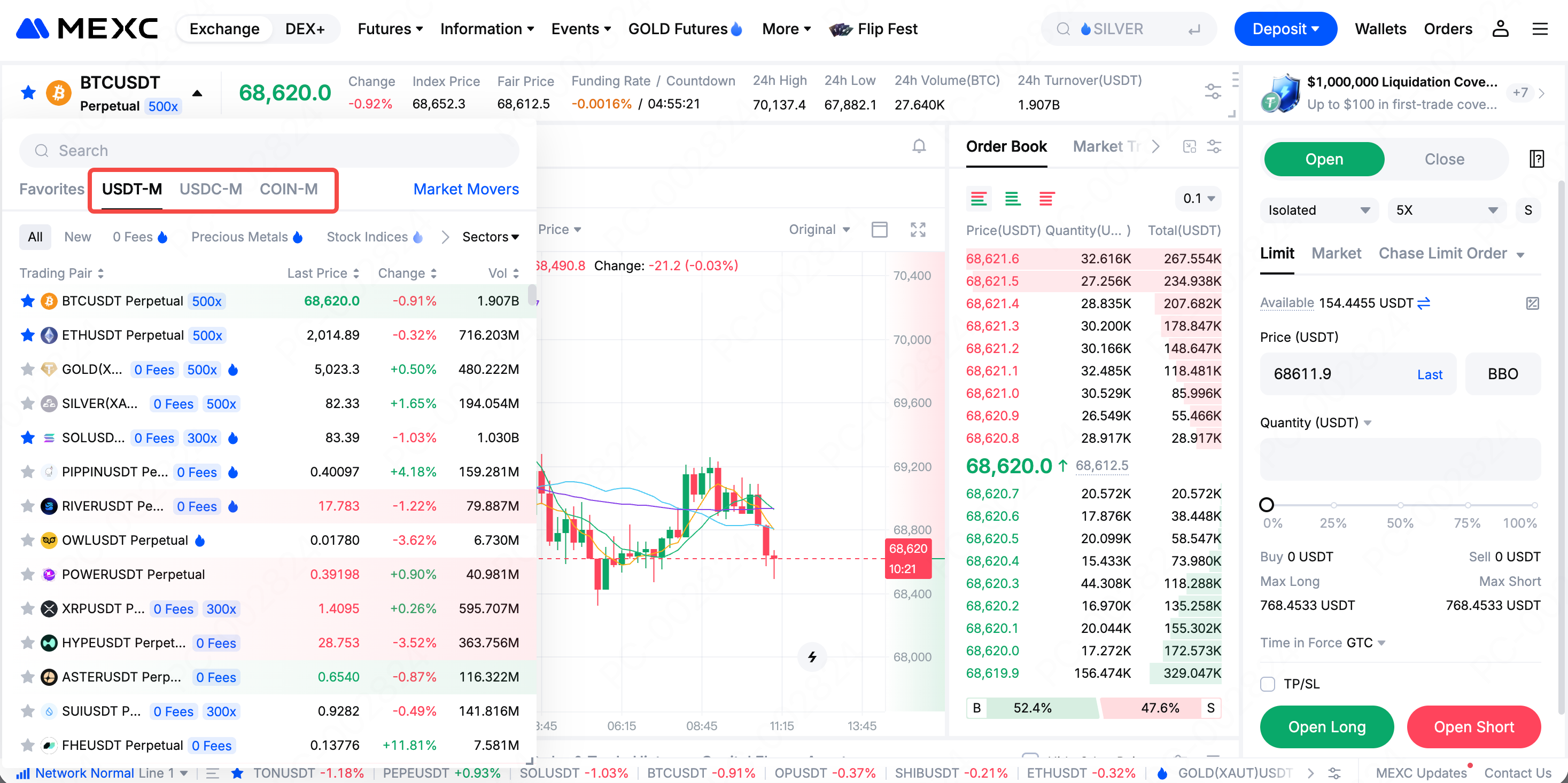 MEXC App→【合约】→选择【USDT 合约】/【USDC 合约】或【币本位】。