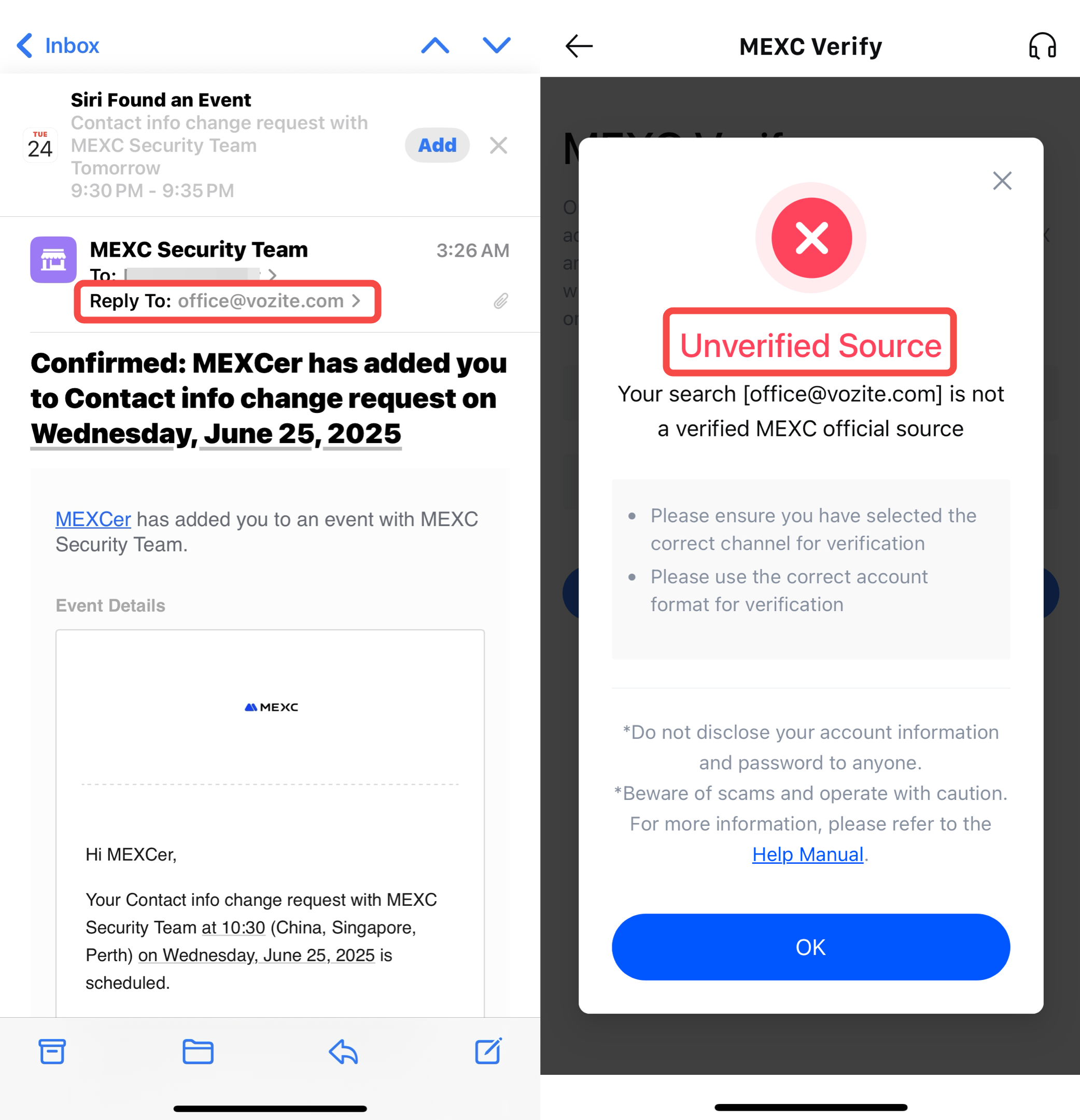钓鱼邮件常常假冒 MEXC 交易所,诱导用户点击恶意链接,登录伪造的网站并输入账户信息,从而盗取资金。有些邮件还附带恶意脚本或软件,打开后可能让黑客访问您的设备,窃取敏感信息,甚至未经授权转移资金。
