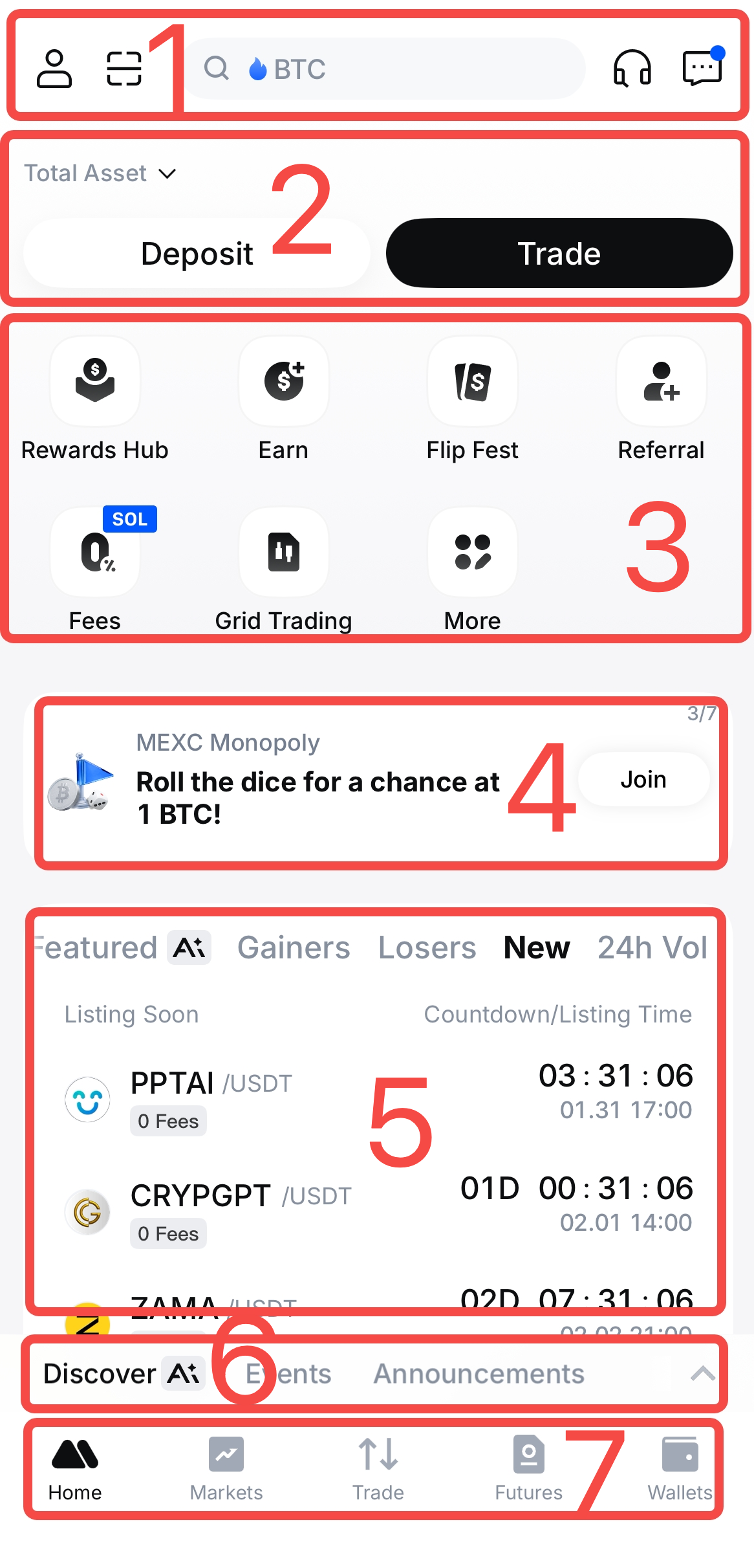 MEXC App 首页集成了七大核心功能区块,帮助您快速访问账户管理、交易服务和市场资讯等功能。本指南将详细介绍每个导航区块的使用方法。