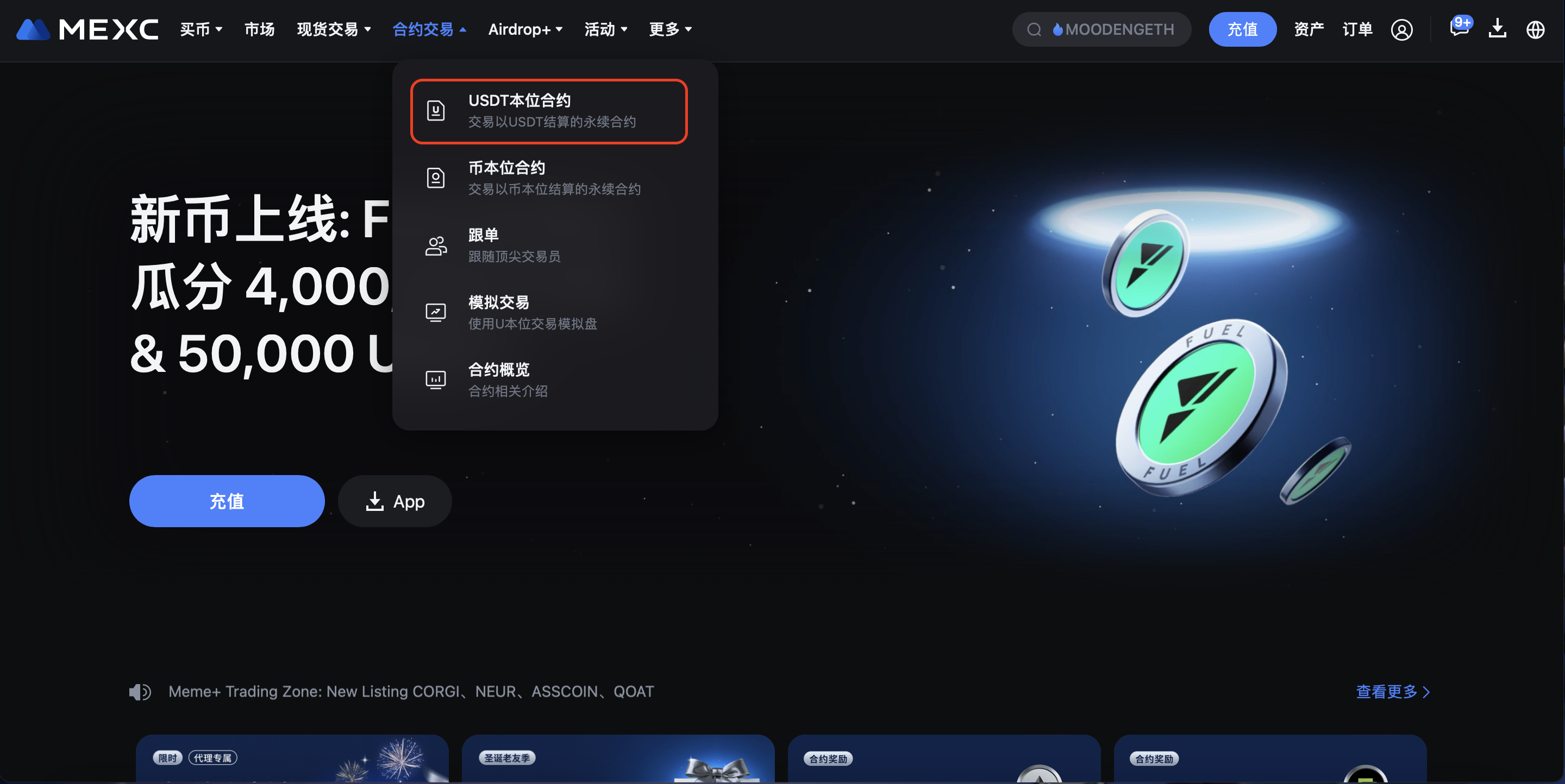 第 1 步:在 MEXC 首頁的【合約交易】下找到【USDT 本位合約】。