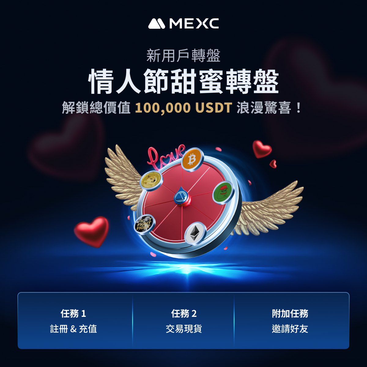 愛意滿滿,盡在 MEXC!今年情人節,轉動轉盤,贏取總價值 100,000 USDT 的代幣禮包,浪漫與獎勵等您來拿! 💕