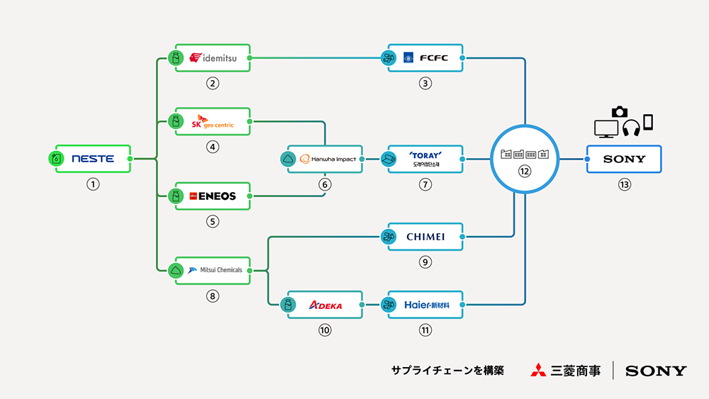 由Sony與三菱商事發起倡議,偕同ADEKA、奇美、ENEOS、台塑化學纖維、韓華集團、出光興產、三井化學、奈斯特、青島海爾新材料研發、SK geo centric、東麗、韓國東麗先進材料共14家企業建構跨國再生塑料供應鏈,Sony將以開發適用於高階影音產品的高品質再生塑料為目標。
