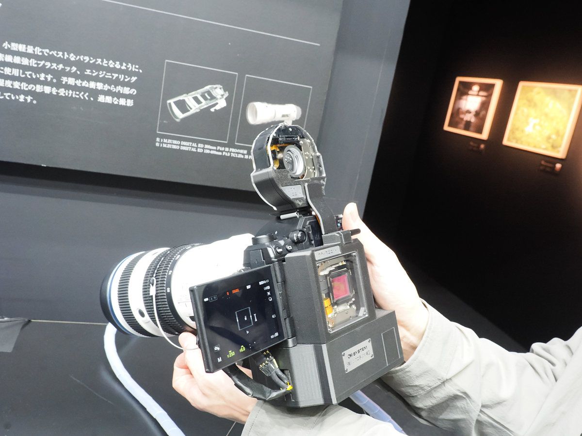 ▲OM System也陳列真實的相機內部防手振模組與ED50-200mm F2.8 IS PRO的防手振模組